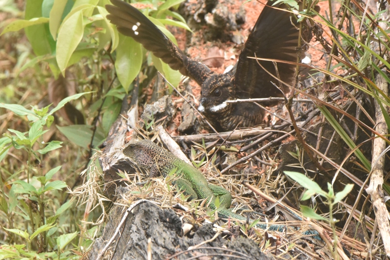 Ce fût encore le cas cette année 2017 où un couple d’Engoulevent noirâtre (Caprimulgus nigrescens) était découvert dans la clairière d'Aya. L'emplacement du nid était situé en hauteur sur un tronc mort au sol. Mâle et femelle se relayaient pour couver l’œuf unique. Un Ameive commun mâle (Ameiva ameiva) s’approcha du mâle couveur... Immédiatement, l’engoulevent se mit en position défensive gonflant sa poitrine et déploya ses ailes laissant apercevoir ses taches blanches. Intimidation gagnante, puisque le reptile changea de cap et s’éloigna…